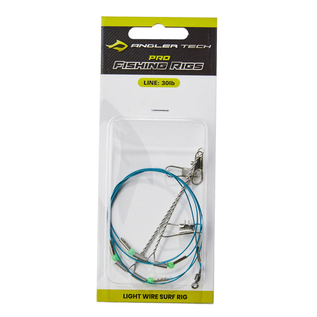 The Angler Tech wire surf rig is a pre-tide fishing rig designed to make your fishing easier. Made with Quality 30lb wire leader, it is not fitted with any hooks so to allow the angler to attached their prefered hook style and size depending on the species of fish they are targeting. Easy to use simply attach the snap swivel to your line and bait up and you are ready to go! Suitable for both novice and experienced fisherman, it's the perfect addition to have In the tackle box while out fishing!