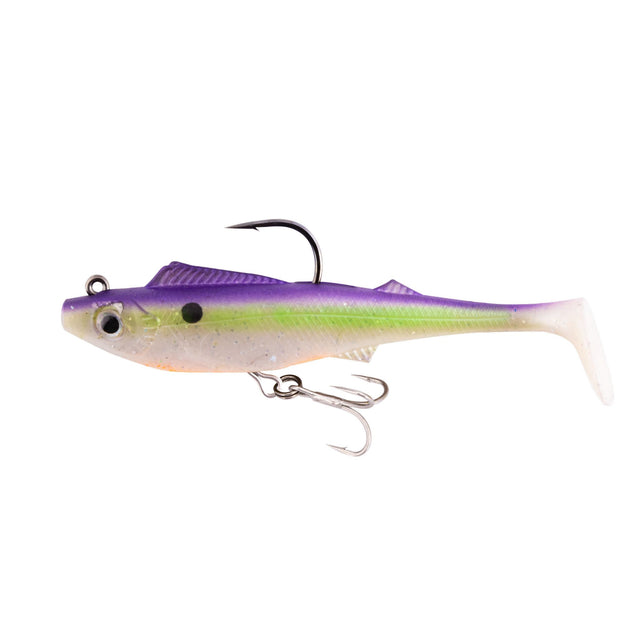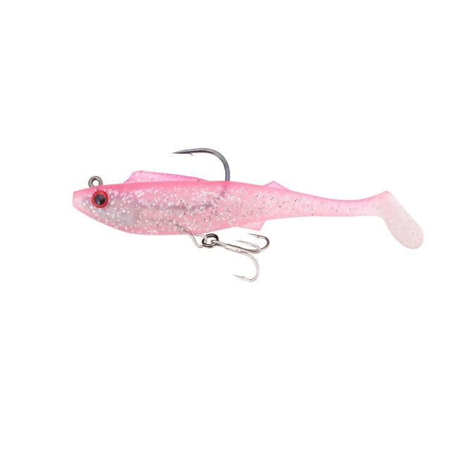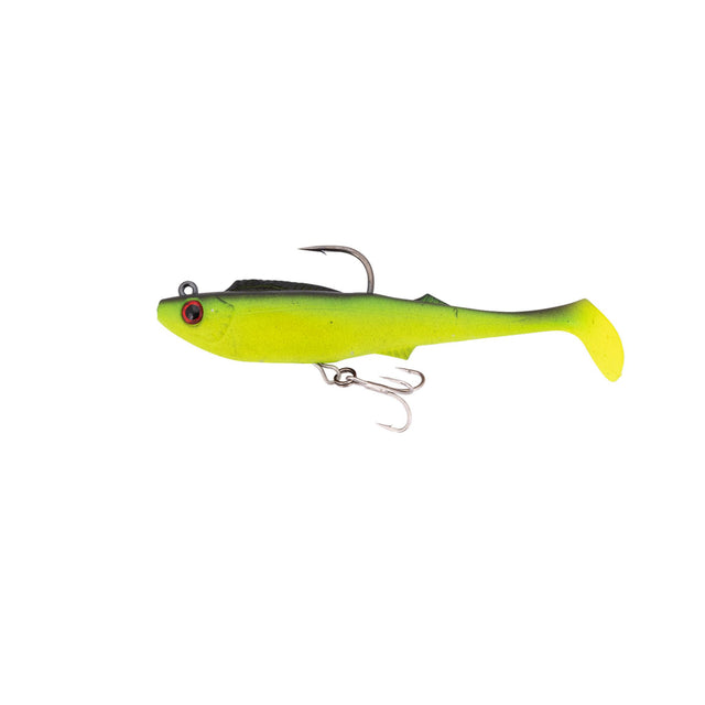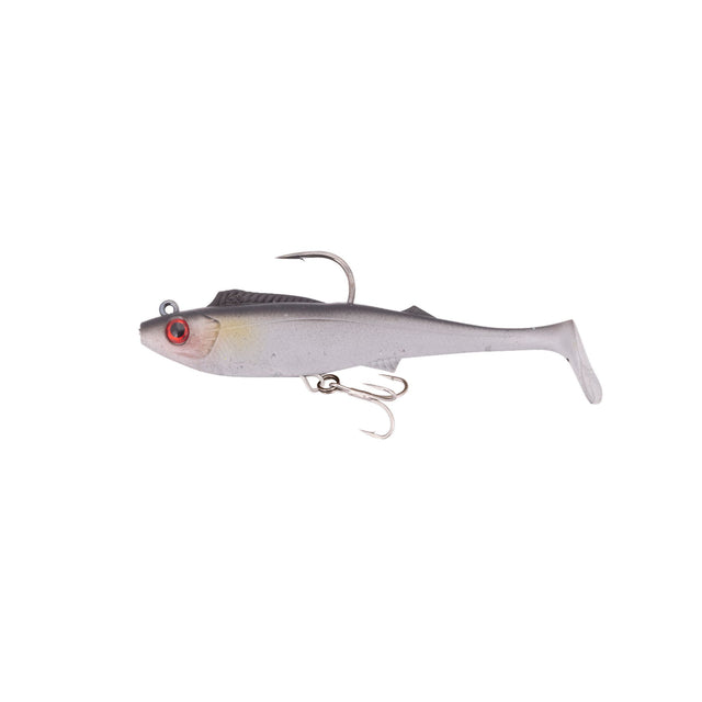 The Berkley Shimma Pro-Rig is built for big fish that pull hard. Fitted with a removable weighted hook and a single Owner STX Taff Wire Treble and a Hyperwire split ring, this bait is an out-of-the-packet solution for prized fish like mulloway, barramundi and Murray cod. With a thick body profile and a tapered off paddle tail, the Shimma Pro-Rig has a strong body roll and a wide tail action, perfect for slow rolling across weed beds, rock bars, and drop offs for those ambush predators. Built from durable Thermal Plastic Elastomer (TPE), the body is super tough and withstands plenty of punishment from predators with serious jaw strength, and raspy or toothy mouths! The Shimma Pro-Rig is available in ten colours and three sizes to suit a wide range of species in both fresh and saltwater environments. Every angler hunting serious fish needs a Shimma Pro-Rig in the tackle box.