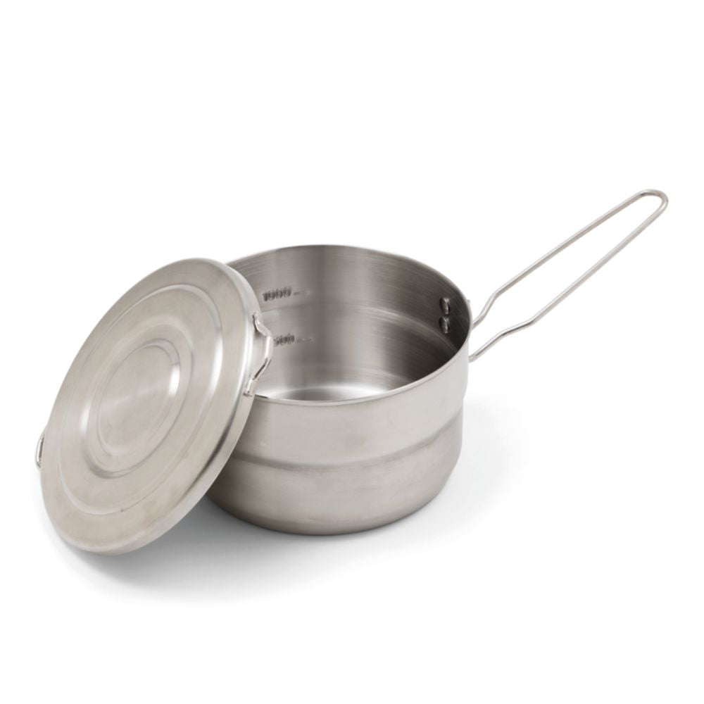 Perfect for scouts or hiking, this compact seamless stainless steel mess kit is ideal for preparing small meals on the go. The folding handle keeps the lid secure and in place while travelling.